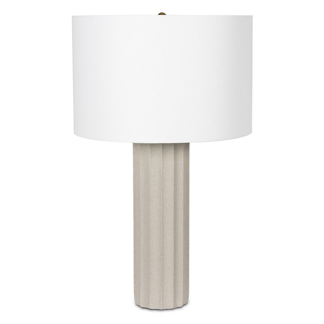 The Tambour Table Lamp features a modern scalloped design with a natural concrete base, highlighting...
