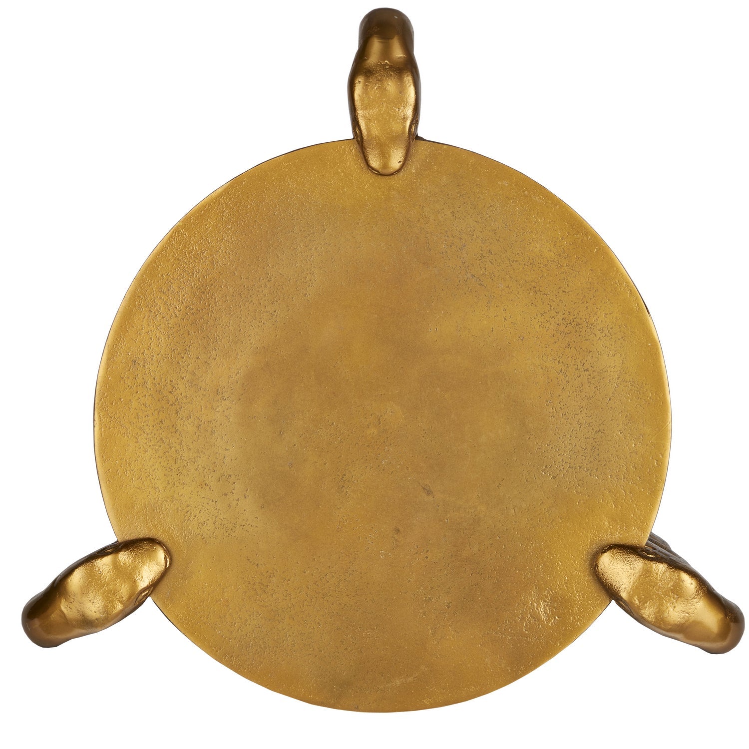 Supporting the disc top of the Serpent Brass Accent Table are curvy creatures that pull a balancing act as they clamp down on its thin surface. This is a whimsical aspect of this design. Made of cast aluminum in an antique brass finish, the gleaming gold occasional table will certainly be a conversation starter in any space, as it will command attention when the luminous surfaces glow when light touches them. Illustrating the artisanal aspects of cast aluminum, there are drifts of patina throughout the profile.