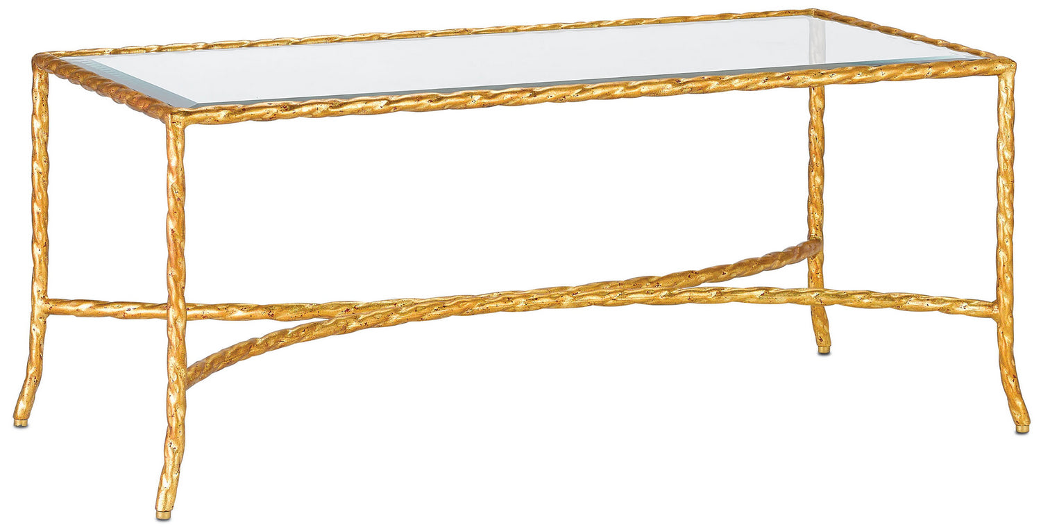 The designs of Gilbert Poillerat and Jean-Henri Jansen that were made for Maison Jansen in the mid-twentieth century inspired the Gilt Twist Bronze Cocktail Table. Design notes on this gold cocktail table include the twisting wrought-iron frame, the way the rope-like metal embraces the inset glass top, and the gilt bronze finish.