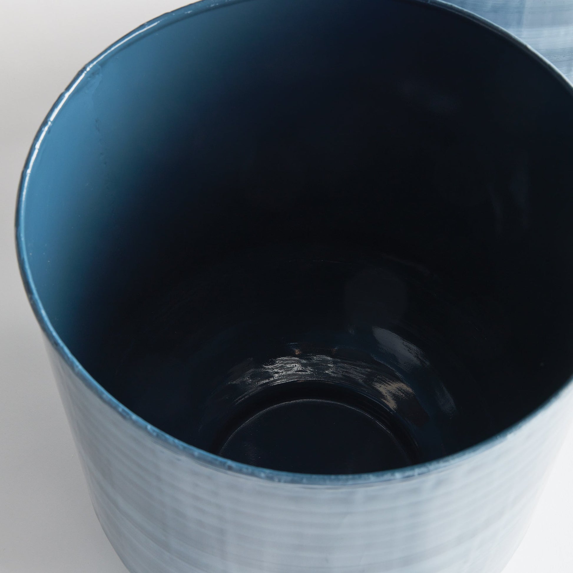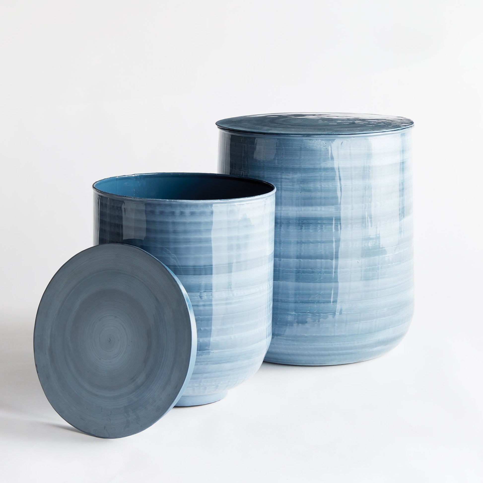 This modern pair of drum tables with removable tops are the perfect storage solution for the cozy space. In a clever use of enameled iron, they are painted by hand. A refined, horizontal swirl design, each one prettier than the next. With layers of delicate strokes in a coastal-inspired blue gray palette, it is modern artistry defined.