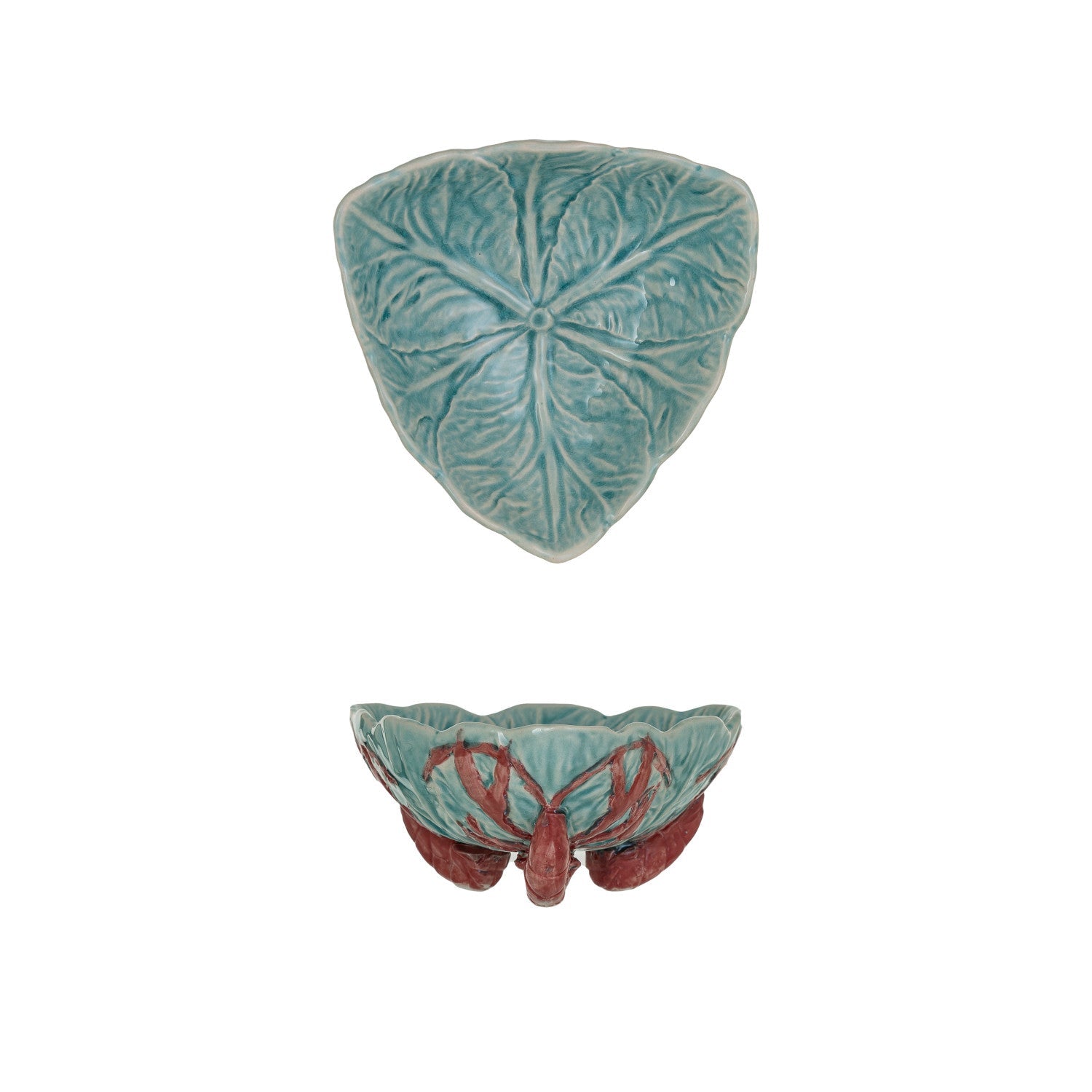 This stoneware bowl is a fun and functional piece that will spice up the home. The bowl has a footed base that features a cute lobster design on the foot, giving it a nautical and vintage vibe. The bowl has a round shape with a smooth rim and a deep interior. It is finished with a reactive crackle glaze in blue green and dark red colors that creates a stunning and unique effect. The bowl is made of high-quality stoneware that is durable, microwave-safe, and dishwasher-safe. Use this bowl to serve soups, salads, or snacks, or to display fruits, nuts, or candies. This bowl is a unique and lovely item that will enhance any space. This is a beautiful and fun piece that will add beauty and freshness to the table and kitchen serving.
