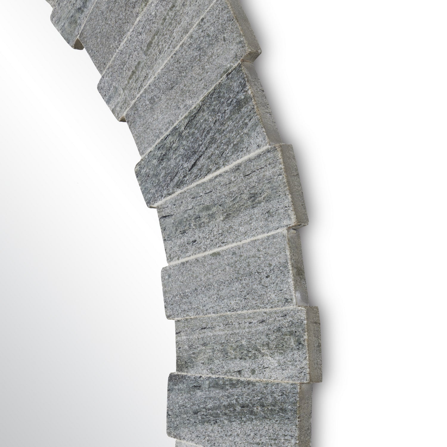 The Dario Round Gray Mirror is a seriously sturdy decorative mirror. Made of slices of marble in varying thicknesses and lengths, the interplay of short and long, and thick and thin brings the profile a nice dose of texture, as does the graining in the natural material. Aimee Kurzner was inspired by a tile mosaic when she designed the piece. A refined aspect of the design is how the substrate base is painted in a matching hue to make every aspect of the gray mirror seamless.