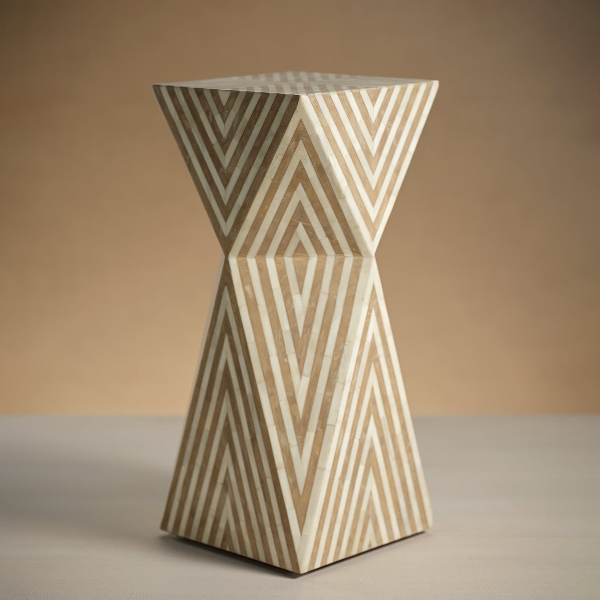 The bone inlay stool brings a visually interesting piece of indoor decor to your home. This modern stool is offered in a unique sculptural shape. Delicate carved pieces of bone have been individually inlaid onto a wooden frame in an elaborate geometric pattern. Layers of tan tone resin are then used to fill alternating the bone.