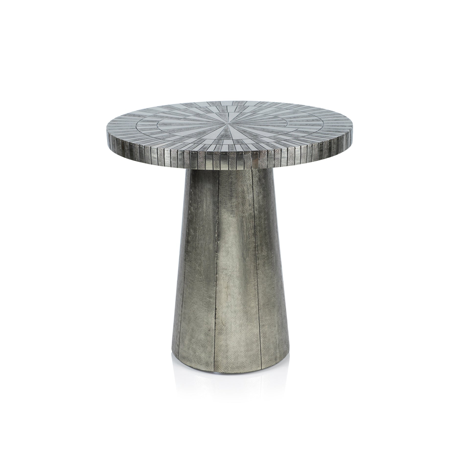 This side table features a gorgeous round metal top with geometric designs. The round and textured surface that adds design interest provides plenty of space for your cups, plates, books, magazines and accessories. A gorgeous pedestal base lift the top and provides a sturdy foundation for the table.