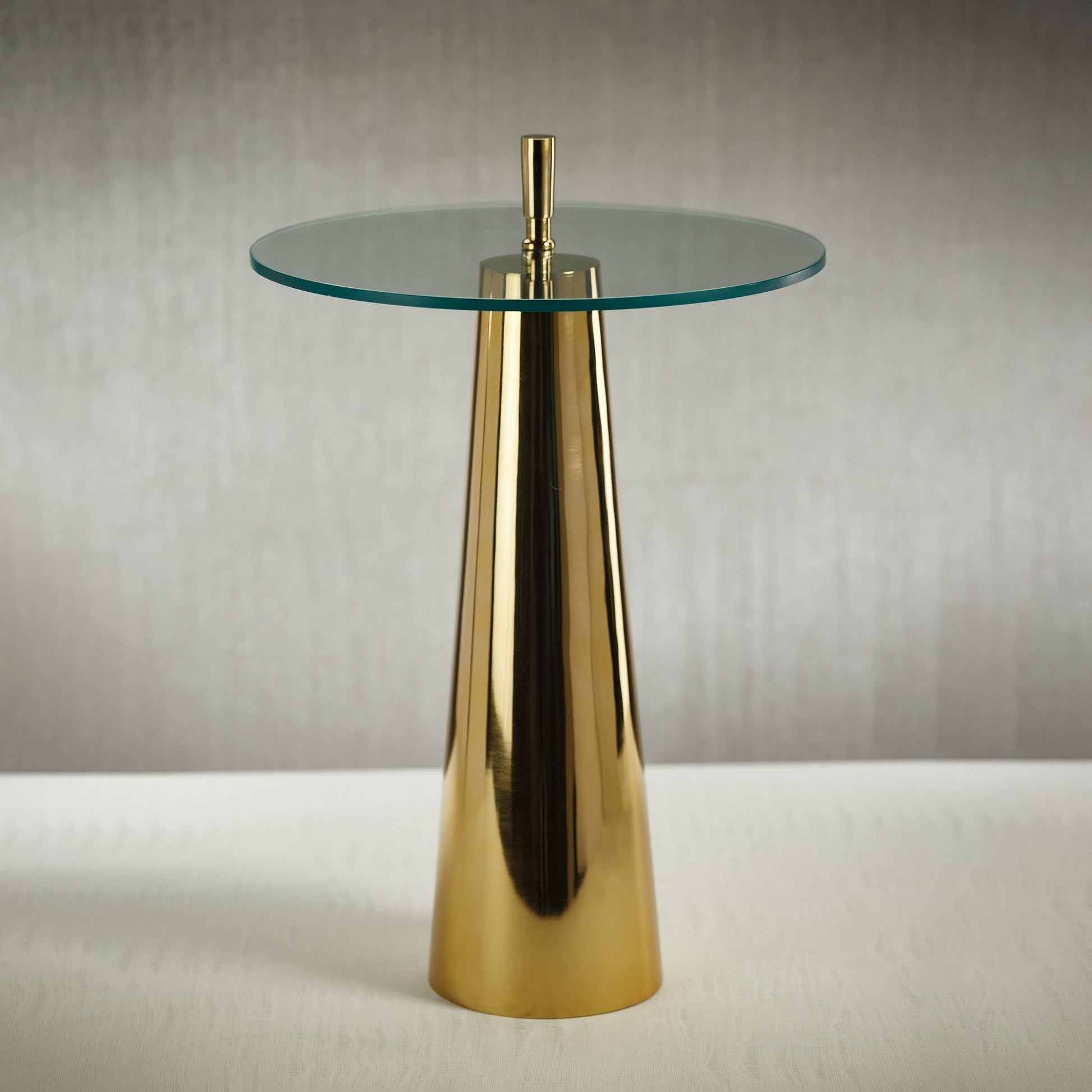 This Sassari Accent Table is designed for today's most stylish living room décor and features stunning details. Form and function meet in one to create a one-of-a-kind accent piece. Conical metal stand, clear thick glass tabletop…truly eye-catching appearance.